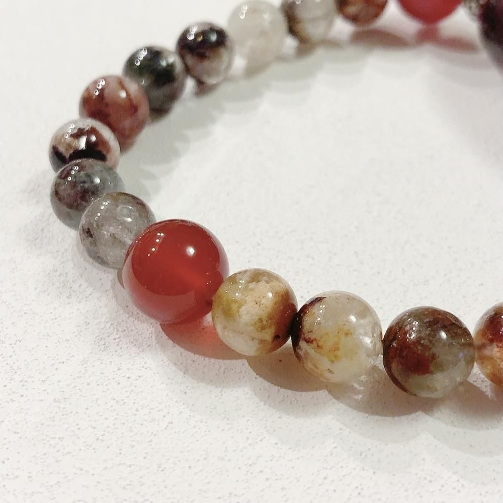 天然石はガーデンクォーツを15個、カーネリアン(赤瑪瑙)10mm玉を3個セットしました。
