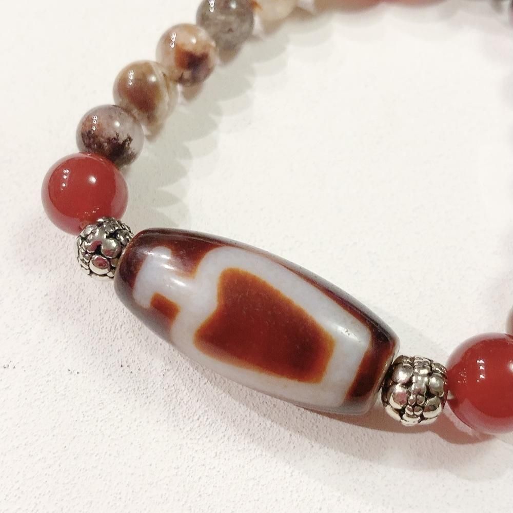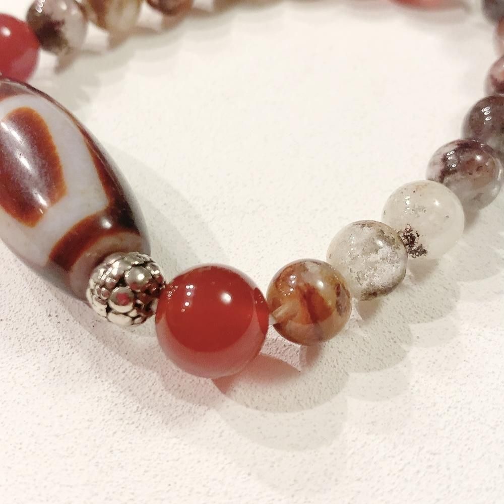 素材:瑪瑙(天珠)、ガーデンクォーツ、メタルビーズ、カーネリアン