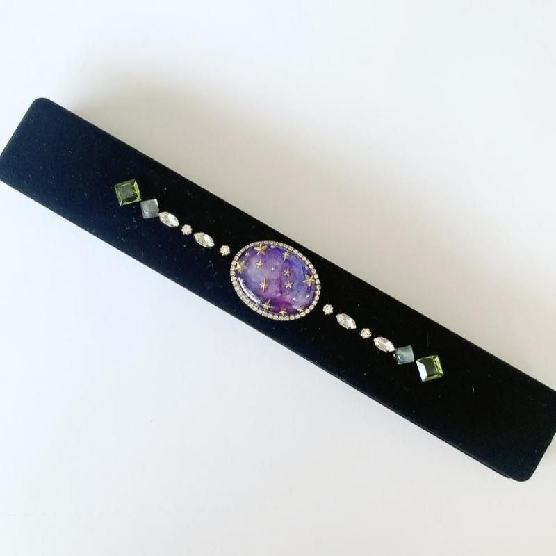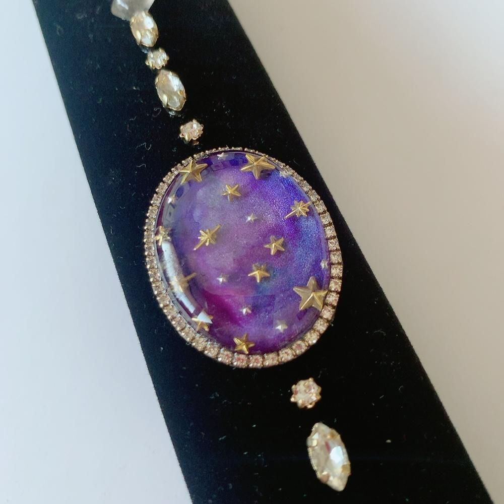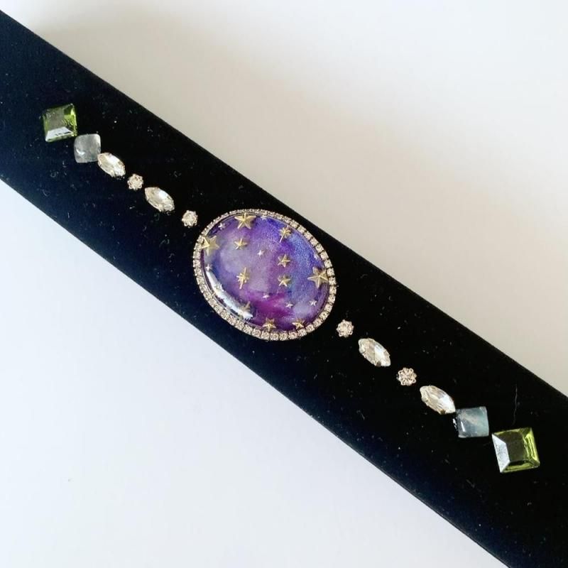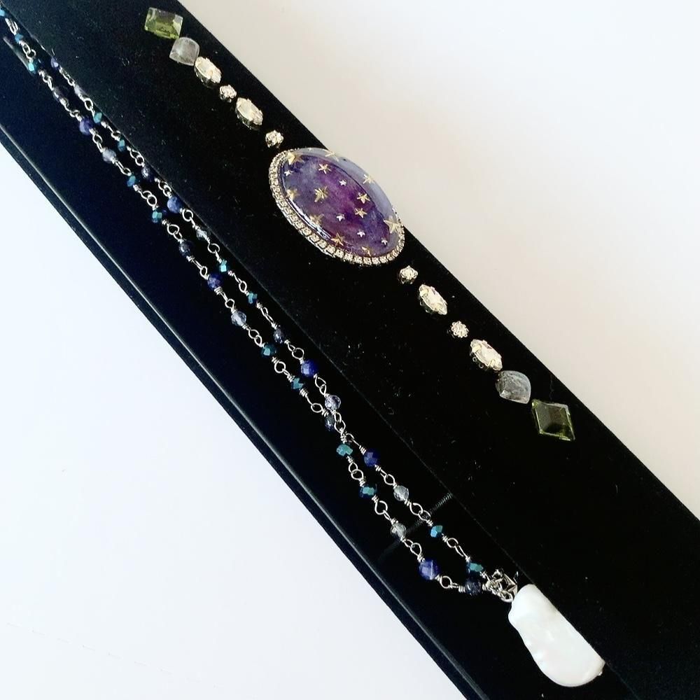 ベルベット素材のネックレスケースに、オリジナルのレジンで作られた飾りやビジューをつけました。